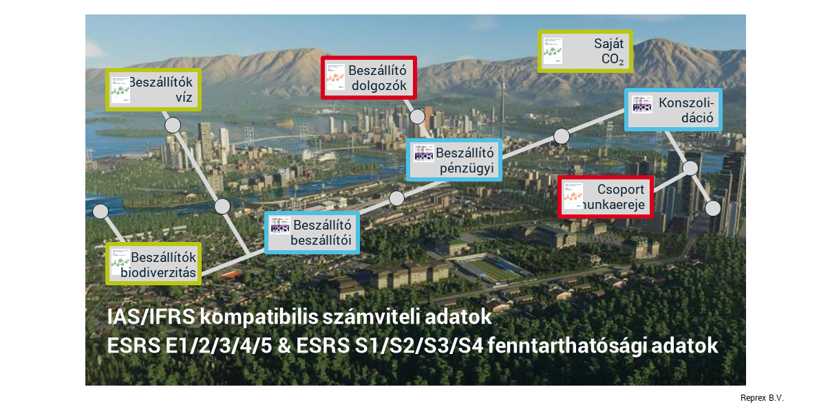 Bővebben: Európai Fenntarthatósági Beszámolási Standardok ESRS (Q165); innen elérhető az öt környezetvédelmi standard (klíma, víz, …) és a négy társadalmi (saját és beszállítói munkaerő, …)