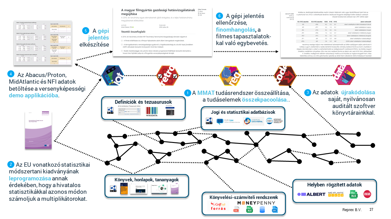 A tudásbázis kodifikálja emberi és gépi nyelven a filmes versenyképesség fogalmait, egyben képes beolvasni és kiszámítani a versennyképességi tanulmány indikátorati bármelyik évben, bármelyik filmre.